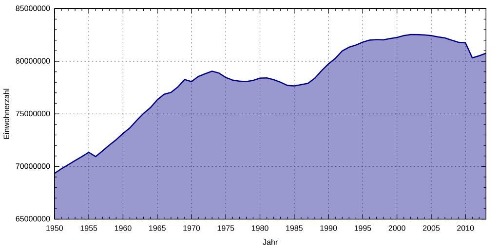 | Keywords: Germany population.svg en Germany's population 1950-2013 de Einwohnerentwicklung von Deutschland seit 1950 own ; data from https //www destatis de/DE/ZahlenFakten/Indikatoren/LangeReihen/Bevoelkerung/lrbev03 html Statistisches Bundesamt Deutschland Gorgo 2012-08-22 Gnuplot script to generate this plot gnuplot <source lang gnuplot > /usr/bin/gnuplot gnuplot 4 2 / Ubuntu 8 10 input set timefmt Y set datafile separator ; output unset key set style data lines set style fill transparent solid 0 4 set grid set xdata time set xlabel 'Jahr' set xrange '1950' '2013' set xtics 157680000 set mxtics 5 set format x ' Y' set ylabel 'Einwohnerzahl' set ytics 5000000 set mytics 5 set format y ' 0f' set yrange 65000000 85000000 set term svg size 800 400 font Arial 10 set output 'germany_population svg' plot '-' using 1 2 with filledcurves below x1 lt rgb 'dark-blue' lw 2 2013;80767000 2012;80524000 2011;80328000 2010;81752000 2009;81802000 2008;82002000 2007;82218000 2006;82315000 2005;82438000 2004;82501000 2003;82532000 2002;82537000 2001;82440000 2000;82260000 1999;82163000 1998;82037000 1997;82057000 1996;82012000 1995;81817000 1994;81539000 1993;81338000 1992;80975000 1991;80275000 1990;79753000 1989;79113000 1988;78390000 1987;77900000 1986;77780000 1985;77661000 1984;77709000 1983;78008000 1982;78248000 1981;78418000 1980;78397000 1979;78180000 1978;78073000 1977;78111000 1976;78209000 1975;78465000 1974;78882000 1973;79053000 1972;78821000 1971;78556000 1970;78069000 1969;78269000 1968;77550000 1967;77038000 1966;76864000 1965;76336000 1964;75591000 1963;75046000 1962;74383000 1961;73668000 1960;73147000 1959;72543000 1958;72031000 1957;71475000 1956;70943000 1955;71350000 1954;70945000 1953;70566000 1952;70164000 1951;69785000 1950;69346000 e </source> Cc-zero Temporal population graphs of Germany Images with Gnuplot source code |