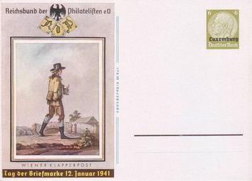 Keywords: Germany Wiener Klapperpost 1941.jpg en Postcard of the Third Reich with a preprinted definitive stamp issued to celebrate the Day of Postage Stamp January 12 1941 There is a reproduction of the engraving Klapperbote Clapper Postman by Hieronymus Benedikti late XVIII c on the right side of the postcard and an overprint for the German occupation of Luxembourg on the German definitive stamp Michel P 4 ru Почтовая ка точка Ге мании ко Дню почтовой ма ки 12 янва я 1941 года а п авой сто оне ка точки помещена еп одукция г авю ы Ие онима Бенедикта Письмоносец с т ещоткой конец XVIII в ; на станда тной ма ке - надпечатка немецкой оккупации Люксембу га ихель P 4 http //www tag-der-briefmarke org/fileadmin/user_upload/_files/Bote_3_2004/17-20Heft3_2008Druck pdf FG Tag der Briefmarke Sammlerkontakte 080830 Tag der Briefmarke 1941 P 241 mit dem Bild der Wiener Klapperpost Gesucht waren Künstler Titel und Entstehungsjahr der Bildvorlage Der Bote 2008 Nr 3 S 17 20 Postal administration of the Third Reich postcard definitive stamp ; Hieronymus Benedikt engraving of the late XVIII c 1941-01-12 Stamp PD-Germany-§134-KUG Germany 1996 01 01 Engraving PD-old-100 German stamps review Overprints on stamps of Germany International Stamp Day Deutsches Reich Stamps of Nazi Germany Postcards of people in Germany Paul von Hindenburg on stamps Clapper Post Stamps of Luxembourg 18th-century engravings Artists from Austria Mail carriers in art Post of Austria Occupation stamps Postal stationery of Germany Postcards of Luxembourg Philatelic organisations