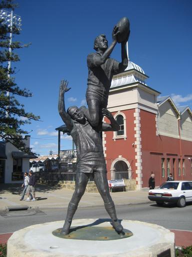 Keywords: Gerovich statue.jpg Statue of John Gerovich's famous mark over Ray French in the 1956 WAFL preliminary final A digital photograph taken by me 2007-08-11 user Moondyne Public domain John Gerovich Photographs by Moondyne