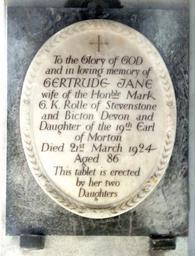 Keywords: GertrudeRolleMonumentStGilesInTheWoods.JPG en Mural monument in St Giles in the Wood parish church To the Glory of God and in loving memory of Gertrude Jane wife of the Hon ble Mark G K Rolle of Stevenstone and Bicton Devon and daughter of the 19th Earl of Morton Died 21st March 1924 aged 86 This tablet is erected by her two daughters own photo own photo Sculpture 1924; photo 2012 Interior of St Giles in the Wood Rolle family Wall mounted church monuments in Devon |