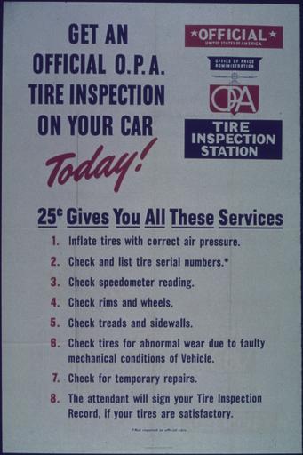 Keywords: "Get an Official OPA Tire Inspection on your Car Today" - NARA - 514354.jpg Scope and content General notes 514354 Local identifier 44-PA-860 Office for Emergency Management Office of War Information Domestic Operations Branch Bureau of Special Services 03/09/1943 - 09/15/1945 Still Picture Records Section Special Media Archives Services Division NWCS-S National Archives at College Park 8601 Adelphi Road College Park MD 20740-6001 1941 - 1945 Record group Record Group 44 Records of the Office of Government Reports 1932 - 1947 Record group ARC 373 World War II Posters compiled 1942 - 1945 Series ARC 513498 File unit File unit ARC Variant control numbers NAIL Control Number NWDNS-44-PA-860 Other versions <gallery> File Get_an_Official_OPA_Tire_Inspection_on_your_Car_Today _-_NARA_-_514354 tif tif File Get_an_Official_OPA_Tire_Inspection_on_your_Car_Today _-_NARA_-_514354 jpg jpg </gallery> NARA-cooperation PD-USGov World War II posters about tires from the United States Gas station signs in the United States Office of Price Administration |