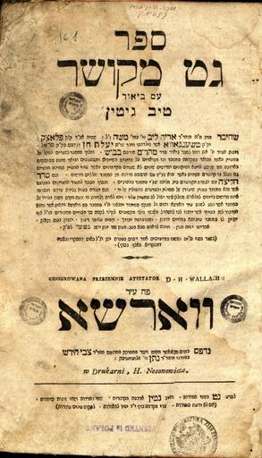 | Keywords: Get Mekushar. Warsaw, 1815. First Edition.jpg en Get Mekushar with Tiv Gittin Order of the Get and Chalitza with elucidation by Rabbi Aryeh Leib Zinz Rabbi of Plotzk Warsaw 1815 First edition <br /> 89 1 10 leaves 34 5 cm <br /> Published by the author Mahara l Zinz The flyleaf features an old handwritten story 'Ma'ase Rokeich' in which the Ba'al HaRokeich visits his disciple in a dream Light tear with loss Owner stamps including one from Avraham Abish Margoliot of Radum possibly author of the Tzilusa D'Avraham <br /> LOT 466 in auction 25 2 15 3 Shatner Center 1st Floor Givat Shaul Jerusalem he גט מקושר ע כתב גיטין 49790331 https //il bidspirit com/portal/ lang en /lotPage/source/catalog/auction/54ae7d26e4b0df06286cfb31/lot/54c8de0de4b0e5a286c8a96f bidspirit com Aryeh Judah Leib ben Moses Teomim אריה ייב צינץ אריה ייב צינץ 1768-1833 1815 http //www hebrewbooks org/24579 PD-old-auto-1923 1833 Aryeh Leib Tzintz Title pages in Hebrew |