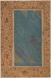 | Keywords: Ghazal by Sa'di.png en This calligraphic fragment contains a ghazal lyric poem by the Persian poet Shaykh Sa'di died 1292 691 AH The verses describe a lover's search for his beloved and his request that she show herself to him The verses are written in nasta'liq script using white light blue red and yellow ink on a blue paper Rangin colored inks add variety to the composition and are found in a number of calligraphies produced during the 16th century The corners left open by the intersection of the diagonal verses and the rectangular frame are decorated by illuminated triangles or thumb pieces The text panel is framed by a border consisting of cream-colored paper decorated with gold flecks cut out and pasted to the folio The composition is placed on a larger beige sheet of paper decorated with deer birds and various vegetal motifs The fragment is neither dated nor signed However it appears to have been produced in Safavid Iran and placed later into a muraqqa' album of calligraphies fa غزل ŒÙ‡Ø§ÛŒÛŒ از سعدی به خط نستعلیق به سبک رنگین century 16 CE http //www wdl org/en/item/2423/ Ghazal by Sa'di Creator Saadi Custom license marker 2012 09 09 PD-old-100 Uploaded with UploadWizard Sa'di Persian manuscripts Manuscripts in Iran Nastaliq Rangin 16th-century illuminated manuscripts |