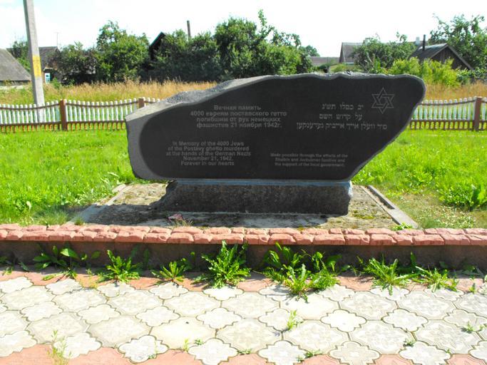 Keywords: Ghetto Pastavy 1a.jpg ru Памятник ев еям Постав убитым немецкими оккупантами и полицаями во в емя Холокоста аходится в Поставах на улице Го ького 2012-07-29 own Avner cc-zero Uploaded with UploadWizard Ghetto Pastavy