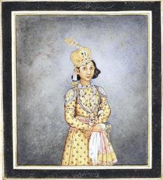 | Keywords: Ghulam Ali Khan 016b.jpg Mirza Mahomed Juwan Bakht Bahadoor 3d son Signed by Ghulam 'Ali Khan A series of 31 paintings by Ghulam Ali Khan fl 1817-55 consisting of views of monuments in and around Delhi and including four portraits of the last Mughal Emperor Bahadur Shah II reg 1837-58 and his sons Watercolour and gold on paper black margin rules three title pages three sheets of portraits all with identifying inscriptions in English and in Persian in nasta'liq script in black ink the portraits with further inscriptions in nasta'liq script with the date November 1852 Christian date written in Arabic in later mounts loose in contemporary green leather-covered despatch box the lid embossed in gold DELHEE 1854 Size paintings 290 x 215 mm and slightly smaller; mounts 318 x 394 mm ; box 435 x 365 x 110 mm File Ghulam Ali Khan 016 jpg 1852-11 Ghulam Ali Khan PD-Art-100 People of the Mughal dynasty |