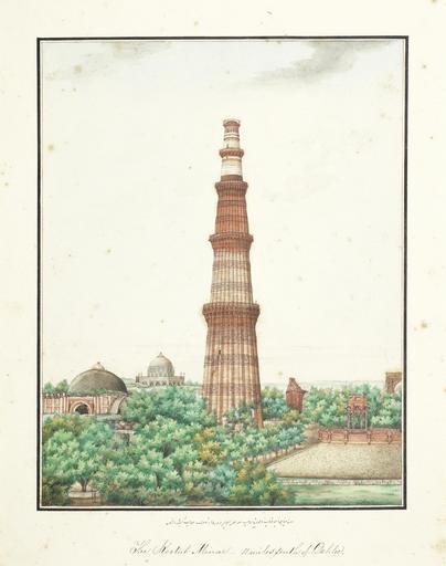 | Keywords: Ghulam Ali Khan 031.jpg The Kootub Minar - 11 miles South of Delhee The minaret of Khwaja Qutb al-Din Qutub Minar together with the tomb of Adham and the Qutub Gate A series of 31 paintings by Ghulam Ali Khan fl 1817-55 consisting of views of monuments in and around Delhi and including four portraits of the last Mughal Emperor Bahadur Shah II reg 1837-58 and his sons Watercolour and gold on paper black margin rules three title pages three sheets of portraits all with identifying inscriptions in English and in Persian in nasta'liq script in black ink the portraits with further inscriptions in nasta'liq script with the date November 1852 Christian date written in Arabic in later mounts loose in contemporary green leather-covered despatch box the lid embossed in gold DELHEE 1854 Size paintings 290 x 215 mm and slightly smaller; mounts 318 x 394 mm ; box 435 x 365 x 110 mm http //www bonhams com/auctions/20833/lot/352/ circa 1852 1854 Ghulam Ali Khan PD-Art-100 Sketches of The Delhee Palace Delhee 1854 Qutb Minar in art |