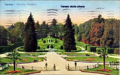 Keywords: Vista del parterre. Dietro la fontana centrale la statua di Umberto I. La fontana superiore, il "grottesco" (1767-69) è sormontata dalla statua dell'Italia liberata. varese giardinipubblici
