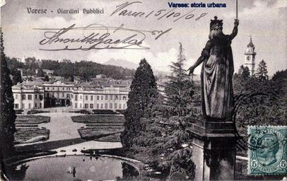Keywords: Vista del parterre e di Palazzo Estense (1766-73). La statua dell'Italia liberata, issata sulla fontana del "grottesco" (1767-69), regge con la mano sinistra le catene spezzate e con la destra la spada sguainata. varese giardinipubblici palazzoestense |