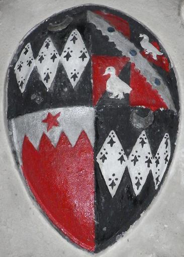 Keywords: GiffardImpalingWyndhamCartoucheGiffardMonumentChittlehamptonChurch.JPG en Ignore misleading filename Heraldic cartouche c 1622 on monument to John Giffard d 1622 of Brightley Chittlehampton Church Devon Arms shown are Quarterly 1st 4th Giffard 2nd Coblegh 3rd Gules on a chief indented argent a mullet of the first FitzWarren own photo own photo 2012-05 St Hieritha Chittlehampton interior FitzWarin arms |