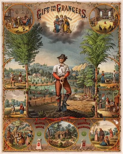 | Keywords: Gift for the grangers ppmsca02956u.jpg Assessments 1 The National Grange of the Order of Patrons of Husbandry Gift for the Grangers 1873 print promoting U S farmers' organization The upper left inset shows Farmer's fireside scene of a farming family leading a rather middle-class lifestyle upper right inset shows Grange in session Lower left inset shows Harvest dance lower center inset shows signposts of Ignorance and Sloth pointing towards broken-down cabin and lower right inset shows Biblical scene of Ruth and Boaz gleaners in the fields The central scene shows a farmer with one foot on his shovel above the quote I Pay for All This last is taken from the old British inn-sign of the Five Alls or Four Alls which occurred in a number of variations but usually included a monarch saying I rule for all or I govern all a bishop or minister saying I pray for all a soldier saying I fight for all and a farmer saying I pay for all Modern versions often show John Bull as the one who pays for all as in File Chepstow - The Five Alls inn sign - geograph org uk - 484144 jpg but see File March of Roguery CGrant 1830 caricature Five Alls jpg for a nineteenth-century version with a farmer in lowest position ;TITLE Gift for the grangers / J Hale Powers Co Fraternity Fine Art Publishers Cin'ti ; Strobridge Co Lith Cincinnati O ;CALL NUMBER PGA - Strobridge--Gift for the grangers C size P P ;REPRODUCTION NUMBER LC-DIG-ppmsca-02956 digital file from original LC-USZC4-4642 color film copy transparency LC-USZC6-12 color film copy transparency LC-USZC4-476 color film copy transparency LC-USZ62-1048 b w film copy neg ;SUMMARY Promotional print for Grange members showing scenes of farming and farm life ;MEDIUM 1 print chromolithograph ;CREATED/PUBLISHED Cincinnati O J Hale Powers Co c1873 ;CREATOR Strobridge Co Lith ;NOTES Published in Eyes of the nation a visual history of the United States / Vincent Virga and curators of the Library of Congress ; historical commentary by Alan Brinkley New York Knopf 1997 ;SUBJECTS National Grange--1870-1880 Farmers' groups--1870-1880 Farming--1870-1880 Country life--1870-1880 ;FORMAT Chromolithographs Color 1870-1880 ;REPOSITORY Library of Congress Prints and Photographs Division Washington D C 20540 USA ;DIGITAL ID digital file from original ppmsca 02956 http //hdl loc gov/loc pnp/ppmsca 02956 color film copy transparency LC-USZC4-4642 cph 3g04642 http //hdl loc gov/loc pnp/cph 3g04642 color film copy transparency LC-USZC6-12 cph 3b53241 http //hdl loc gov/loc pnp/cph 3b53241 color film copy transparency LC-USZC4-476 cph 3b51986 http //hdl loc gov/loc pnp/cph 3b51986 b w film copy neg cph 3a04915 http //hdl loc gov/loc pnp/cph 3a04915 ;VIDEO FRAME ID LCPP003B-53241 from color film copy transparency LC-USZC6-12 LCPP003B-51986 from color film copy transparency LC-USZC4-476 LCPP003A-04915 from b w film copy neg ;CONTROL 96512563 loc-image ppmsca 02956 1873 Strobridge Co Lith PD-old 1873 works in the United States Agriculture in art Chromolithographs Farmers in art Shovels and spades in art Strobridge Lithographing Co The National Grange of the Order of Patrons of Husbandry |