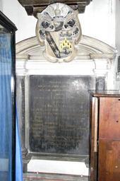 | Keywords: GilbertPaige Died1669 StPeter'sChurch Barnstaple Devon.PNG  en Mural monument to Gilbert II Paige d 1669 of Barnstaple Devon in St Peter's Church Barnstaple south wall of chancel Obscured by a display case containing a clerical vestment left Inscribed in Latin as follows Memoriae sacrum Gilberti Paige mercatoris natu nec non moribus vere generosi viri egregiae pietatis erga Deum fidelitatis erga principem probitatis erga omnes qui obiit 28 die Martii 1669 cui parti sunt a Maria uxore charissima filia Gualteri Tucher mercatoris et Sara uxore eius Gulielmus et Sara adhuc superstites Gualterus Gilbertus Johannes Gualterus Johannes Richardus Maria hoc tumulo adjacente inhumati omnes meritis salvatoris Jesu Christi spe laetae Resurrectionis conquiescentes Translated as Sacred to the memory of Gilbert Paige merchant by birth and indeed by demeanour truly honourable a man of outstanding piety towards God of outstanding fidelity to his Prince of outstanding probity towards all who died the 28 day of March 1669 to whom were born by Mary his dearest wife the daughter of Walter Tucker merchant and Sara his wife William and Sara still surviving Walter Gilbert John Walter John Richard Mary buried in this mound adjoining all at peace together in hope of a joyful Resurrection by the merits of Our Saviour Jesus Christ On top are shown the arms of Paige Argent on a bend sable three eaglets displayed or impaling Tucker Barry wavy argent and azure a chevron raguly or charged with five gouttes de poix between three sea-horses passant sable maned and finned of the third apparently a reference to the arms of the Spanish Company of which many leading Barnstaple merchants were members with crest of Paige above A demi-phoenix displayed own photo Lobsterthermidor <span class signature-talk ></span> 00 37 8 January 2016 UTC 2015 SS Peter and Mary Magdalene Church Barnstaple interior Paige arms Tucker arms Wall mounted church monuments in Devon  |