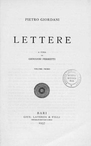 Keywords: Giordani - Opere. Lettere e carteggi, 1937 - 1834454 0005.jpg Book Giordani Pietro Opere Lettere e carteggi G Laterza Bari ita it 1 Lettere / Pietro Giordani ; a cura di Giovanni Ferretti 1 - Bari G Laterza 1937 - 318 p ; 22 cm - Scrittori d'Italia ; 163 Frontespizio BEIC 1834454 Institution BEIC PD-old-100-1923 1937 books Pietro Giordani |