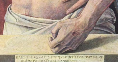 | Keywords: Giovanni bellini, pietà, dettaglio.jpg artwork langswitch Dead Christ Supported by the Madonna and St John Halott Krisztus Szűzanya és Szent János <br> detail tempera panel - HA caption lowercenter Pinacoteca di Brera Milan Yorck creator Giovanni Bellini c 1465 PD-old-100 PD-Art-YorckProject Latin inscriptions in Milan Pietà di Brera by Giovanni Bellini |