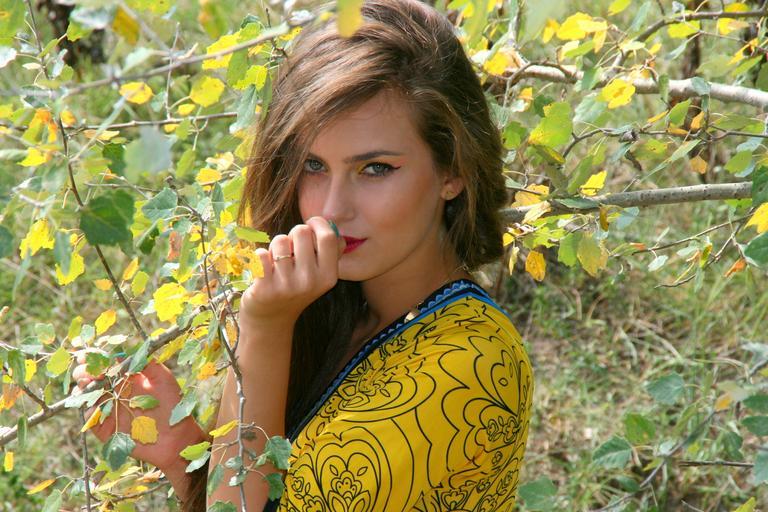 Keywords: girl autumn leaves portrait vegetation beauty seductive yellow