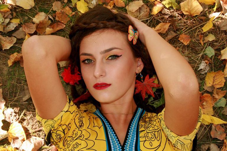 Keywords: girl autumn leaves portrait vegetation beauty seductive yellow