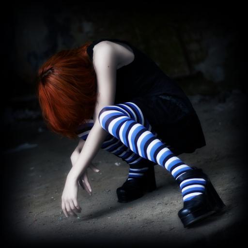 Keywords: girl baby doll model hair posture hairstyle dark background cosplay legs striped style hands