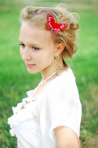 Keywords: girl blonde summer portrait model beauty young view photo portrait person girls eyes smile sunlight female tenderness woman classic white greens grass nature butterfly red