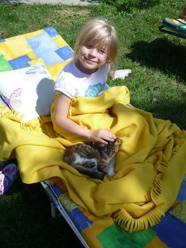 Keywords: girl child cat happy satisfied satisfaction pet smile blond play animal leisure stroke fur childhood youth