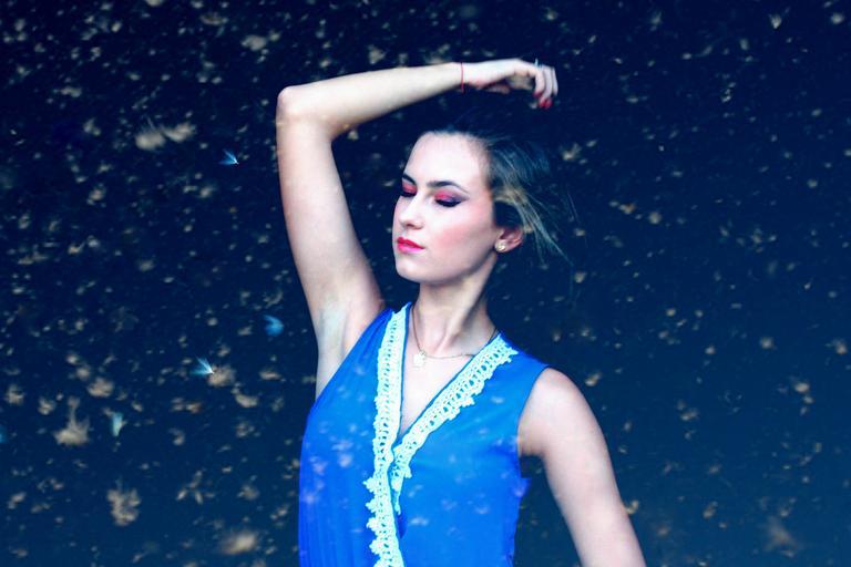 Keywords: girl feather snowflakes flight blue beauty portrait