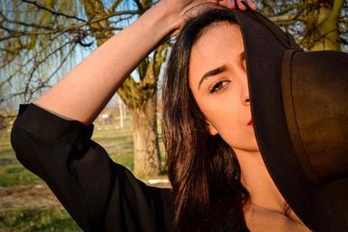 Keywords: girl hat expression dramatic outdoor red lips hair model