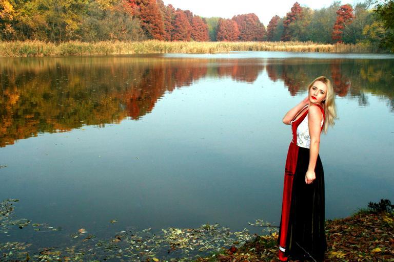 Keywords: girl lake autumn forest reflection dress princess beauty red