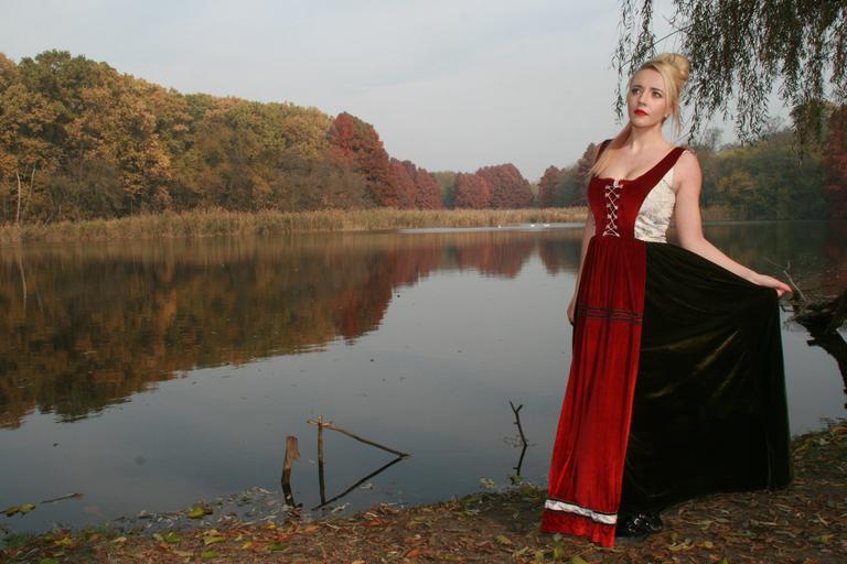 Keywords: girl lake autumn forest reflection dress princess beauty red