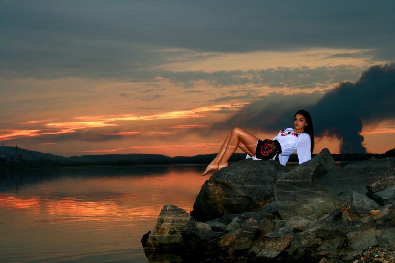 Keywords: girl lake sunset reflection in the evening beauty seductive
