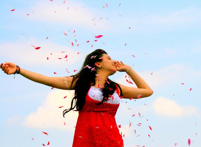 Keywords: girl petals flight red joy