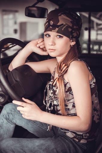 Keywords: girl portrait in military style kids in the car