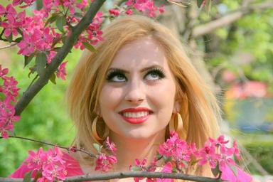 Keywords: girl portrait pink flowers tree seduction smile beauty blonde