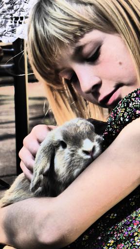 Keywords: girl rabbit stroke animal pet love snuggle embrace hare