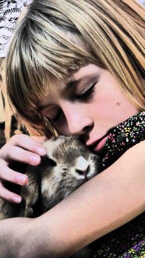 Keywords: girl rabbit stroke animal pet love snuggle embrace hare