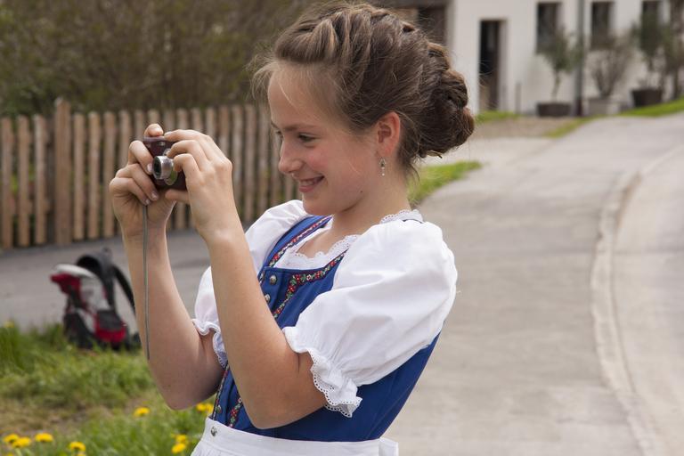 Keywords: girl smiling hairstyles plait woven costume dirndl upper bavaria photographing