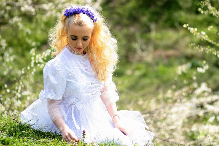 Keywords: girl spring flowers white blue eyes blonde wreath beauty trees