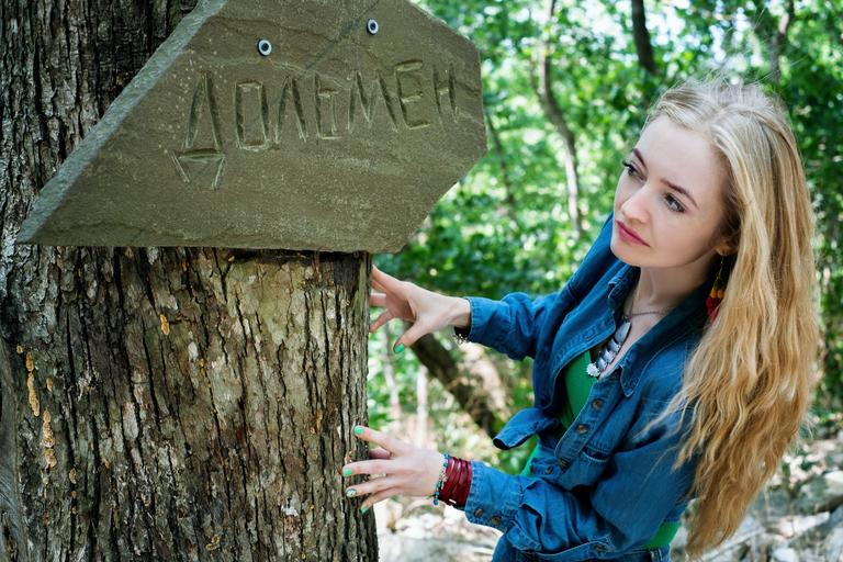 Keywords: girl summer forest dolmen park tourist portrait greens interest bracelet shirt