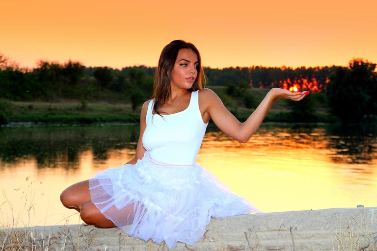 Keywords: girl sunset lake water reflection in the evening beauty white nature sky
