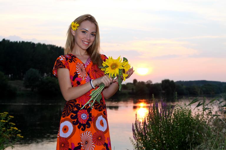 Keywords: girl sunset sunflower lake water reflection blonde beauty in the evening