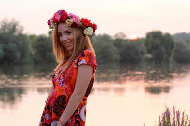 Keywords: girl sunset wreath lake water reflection blonde beauty in the evening