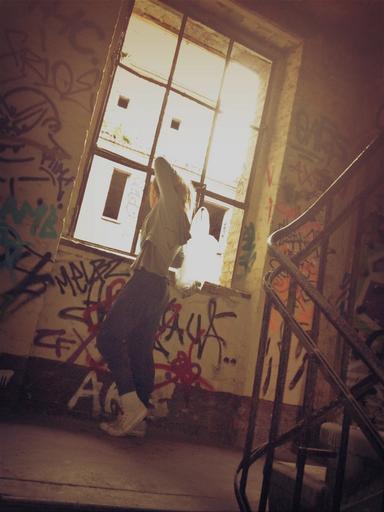 Keywords: girl window stairs indoor young female woman abandoned old building eisfabrik grunge