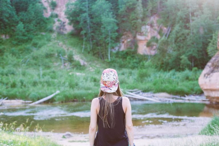 Keywords: girl woman hat brunette long hair people nature river water outdoors adventure trees forest woods hiking trekking
