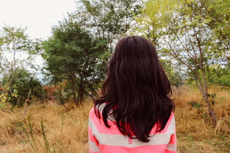 Keywords: girl young female child portrait person long hair black in the woods trees grass people