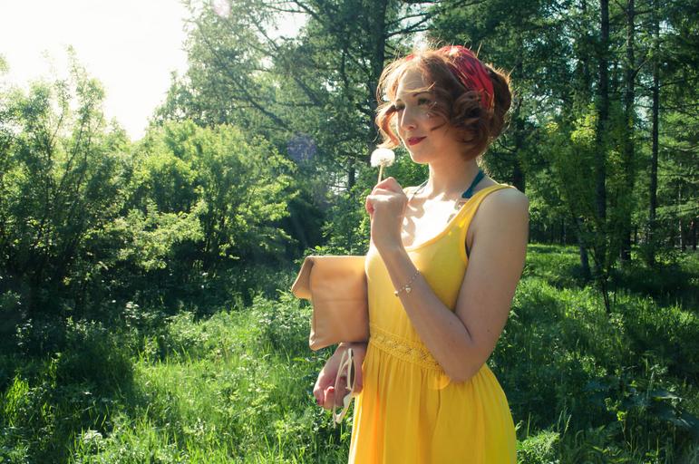 Keywords: girls summer sun stroll dandelion yellow dress redhead orange green leaves beautiful nature