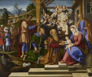 Keywords: Girolamo da Santacroce - The Adoration of the Three Kings - Walters 37261.jpg Walters Art Museum artwork Q18748566 Creator Girolamo da Santacroce Three wise men or magi from the East are described in the Gospels as having seen a new star and journeyed to pay tribute to the child marked as divine by the heavens The wise men were often depicted as kings and by the Renaissance the youngest was frequently depicted as an African here holding a gold vessel containing myrrh a precious resin from Arabia and Africa used for perfume His portrayal reflects both the ethnic diversity encountered by Renaissance painters in a port like Venice frequented by African traders and also the concept of Christ's promise of salvation for all people The splendor of the kings contrasts with the simplicity of the Holy Family Chubby little angels sing the words inscribed on the scroll Glory to God in Heaven and Peace to Men on Earth accompanied by others playing flutes and a violin Zeri Italian paintings in the Walters Art Gallery 276 403-404 ca 1525 1530 Renaissance oil on panel Painted surface incl strip at bottom; d is excl cradle cm 67 7 81 2 0 8 with frame cm 92 08 105 41 6 99 accession number 37 261 12854 Pinacoteca Manfrin Venice prior to September 1872 cat no 51 Don Marcello Massarenti Collection Rome date and mode of acquisition unknown Henry Walters Baltimore Walters Art Museum Henry Walters Acquired by Henry Walters with the Massarenti Collection 1902 GLORIA IN \ ALTISIMI \ DEO \ ET IN TERA \ PASE FRAGIL \ OMENI Glory to God in Heaven and Peace to Men on Earth place of origin Venice Italy Walters Art Museum license 2D Italian Renaissance paintings in the Walters Art Museum Girolamo da Santacroce Media contributed by the Walters Art Museum needs category review |