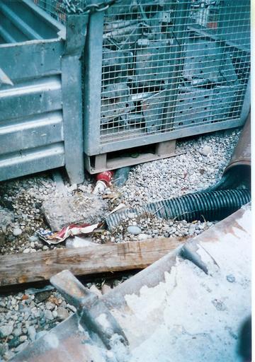 Keywords: Gitterboxen auf Leitungen.jpg Betriebsunfall auf einer Baustelle Sicherheitsmangel bei der Installation stromführender Leitungen hier 225 A ” die Isolierung wurde durch das Gewicht der von einem Kran abgelassenen Box beschädigt sodaß der Strom zum Metall der Gitterbox überging Zu diesem Zeitpunkt berührten zwei Bauarbeiter die Box und erlitten daher einen mittelschweren Stromunfall Diese mußten zur stationären Behandlung in ein Krankenhaus eingeliefert werden own 2006-07 User Mattes Electric cables Work accidents Taken with Panasonic Lumix DMC-LC50 Work by Mattes 2006 User Mattes/Contributions/Topics/Technology Lattice boxes |