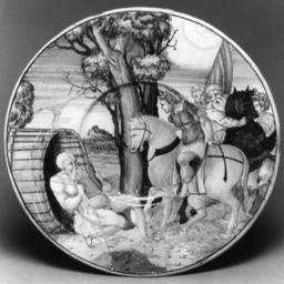 Keywords: Giulio da Urbino - Plate with Alexander and Diogenes - Walters 481493.jpg Walters Art Museum artwork Creator Giulio da Urbino This plate with a depressed center depicts Alexander and Diogenes It is painted in blue turquoise-blue green yellow ochre tan brown black and opaque white At the left Diogenes sits in front of a tub reading At the right Alexander on horseback with three companions stops between Diogenes and the sun In the center is a large tree There is a landscape in the background The back is white stained with green and has one raised circle at the rim In the center in blue is 1534/÷AlisandroˇMagnioˇ/in urbino 1534 Renaissance earthenware with tin glaze maiolica cm 2 9 26 accession number 48 1493 34738 Guidi Collection date and mode of acquisition unknown no 40 Henry Walters Baltimore date and mode of acquisition unknown Walters Art Museum Henry Walters Acquired by Henry Walters date; name Alexander the Great and His Influence over the World from Antiquity to Modern Times Archaeological Museum of Thessaloniki Thessaloniki 1980 The Search for Alexander The Art Institute of Chicago Chicago; New Orleans Museum of Art New Orleans; Royal Ontario Museum Toronto; National Gallery of Art Washington; Museum of Fine Arts Boston Boston; Fine Arts Museums of San Francisco San Francisco 1980-1983 Faience The Colors of the Heavens The Walters Art Museum Baltimore; The Walters Art Museum Baltimore 2003-2004 place of origin Urbino Italy Walters Art Museum license Italian Renaissance maiolica in the Walters Art Museum Giulio da Urbino Urbino maiolica Media contributed by the Walters Art Museum needs category review Media contributed by the Walters Art Museum needs artist update |