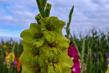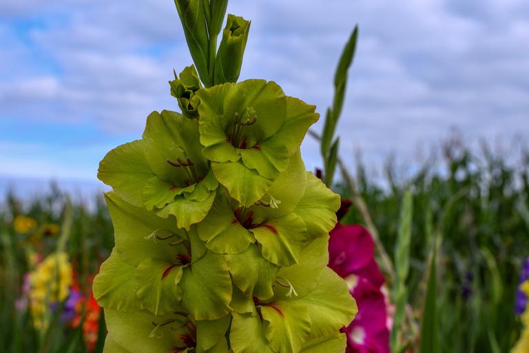 Keywords: gladiolus flower summer bloom plant field of flowers colorful green blossom bloom sky color