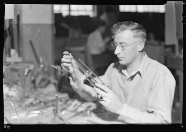 | Keywords: nara:arcid=518651 u.s. national archives usnationalarchives lewis hine lewishine 1937 millville new jersey newjersey the great depression thegreatdepression blackandwhite monochrome photo border black and white Original Caption:  Millville, New Jersey - Glass bottles. L. G. Nestor Co. Tube worker blowing conductivity cell. This highly skilled worker takes glass tubing and blows it into the intricate shapes needed for chemical ware. He uses blue prints in determining the size of the bottles he blows. The glass is heated ready for blowing over the small gas flame shown in the left center of the picture, March 1937  U.S. National Archives’ Local Identifier: 69-RP-422  Photographer:  Hine, Lewis   Subjects: The New Deal Tennessee Valley Authority Works Progress Administration Work Portraits The Great Depression   Persistent URL:  research.archives.gov/description/518651  Repository:  Still Picture Records Section, Special Media Archives Services Division (NWCS-S), National Archives at College Park, 8601 Adelphi Road, College Park, MD, 20740-6001.   For information about ordering reproductions of photographs held by the Still Picture Unit, visit: www.archives.gov/research/order/still-pictures.html  Reproductions may be ordered via an independent vendor. NARA maintains a list of vendors at www.archives.gov/research/order/vendors-photos-maps-dc.html   Access Restrictions: Unrestricted Use Restrictions: Unrestricted Original Caption:  Millville, New Jersey - Glass bottles. L. G. Nestor Co. Tube worker blowing conductivity cell. This highly skilled worker takes glass tubing and blows it into the intricate shapes needed for chemical ware. He uses blue prints in determining the size of the bottles he blows. The glass is heated ready for blowing over the small gas flame shown in the left center of the picture, March 1937  U.S. National Archives’ Local Identifier: 69-RP-422  Photographer:  Hine, Lewis   Subjects: The New Deal Tennessee Valley Authority Works Progress Administration Work Portraits The Great Depression   Persistent URL:  research.archives.gov/description/518651  Repository:  Still Picture Records Section, Special Media Archives Services Division (NWCS-S), National Archives at College Park, 8601 Adelphi Road, College Park, MD, 20740-6001.   For information about ordering reproductions of photographs held by the Still Picture Unit, visit: www.archives.gov/research/order/still-pictures.html  Reproductions may be ordered via an independent vendor. NARA maintains a list of vendors at www.archives.gov/research/order/vendors-photos-maps-dc.html   Access Restrictions: Unrestricted Use Restrictions: Unrestricted |