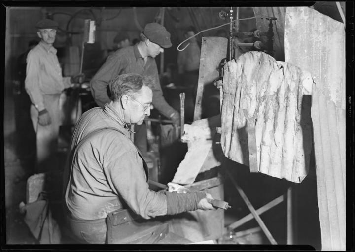 | Keywords: nara:arcid=518639 u.s. national archives usnationalarchives lewis hine lewishine 1937 millville new jersey newjersey the great depression thegreatdepression blackandwhite monochrome photo border black and white Original Caption: Millville, New Jersey - Glass bottles. T. C. Wheaton gaffer finishing necks of wide mouthed jars. He rotates the bottle on a sheet of iron pressing open the mouth with the tool he is holding in his right hand. The jars are then taken by snapping-up boy to be annealed. The white formation on the right hand side of the picture is molten glass which has been hung there by the blowers. It is the excess glass which has been left over after they finished blowing the bottle, March 1937 U.S. National Archives’ Local Identifier: 69-RP-412 Photographer: Hine, Lewis Subjects: The New Deal Tennessee Valley Authority Works Progress Administration Work Portraits The Great Depression Persistent URL: research.archives.gov/description/518639 Repository: Still Picture Records Section, Special Media Archives Services Division (NWCS-S), National Archives at College Park, 8601 Adelphi Road, College Park, MD, 20740-6001. For information about ordering reproductions of photographs held by the Still Picture Unit, visit: www.archives.gov/research/order/still-pictures.html Reproductions may be ordered via an independent vendor. NARA maintains a list of vendors at www.archives.gov/research/order/vendors-photos-maps-dc.html Access Restrictions: Unrestricted Use Restrictions: Unrestricted Original Caption: Millville, New Jersey - Glass bottles. T. C. Wheaton gaffer finishing necks of wide mouthed jars. He rotates the bottle on a sheet of iron pressing open the mouth with the tool he is holding in his right hand. The jars are then taken by snapping-up boy to be annealed. The white formation on the right hand side of the picture is molten glass which has been hung there by the blowers. It is the excess glass which has been left over after they finished blowing the bottle, March 1937 U.S. National Archives’ Local Identifier: 69-RP-412 Photographer: Hine, Lewis Subjects: The New Deal Tennessee Valley Authority Works Progress Administration Work Portraits The Great Depression Persistent URL: research.archives.gov/description/518639 Repository: Still Picture Records Section, Special Media Archives Services Division (NWCS-S), National Archives at College Park, 8601 Adelphi Road, College Park, MD, 20740-6001. For information about ordering reproductions of photographs held by the Still Picture Unit, visit: www.archives.gov/research/order/still-pictures.html Reproductions may be ordered via an independent vendor. NARA maintains a list of vendors at www.archives.gov/research/order/vendors-photos-maps-dc.html Access Restrictions: Unrestricted Use Restrictions: Unrestricted |
