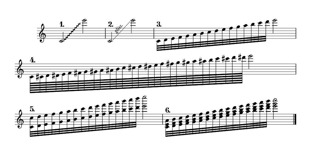 | Keywords: Glissando.svg en Glissandi 1 Glissando notated with wavy line 2 Glissando notated with straight line and gliss 3 Diatonic Glissando 4 Chromatic Glissando 5 Octave glissando 6 Chord glissando de Glissandi 1 Glissando mit Wellenlinie notiert 2 Glissando mit gerader Linie und žgliss notiert 3 Diatonisches Glissando 4 Chromatisches Glissando 5 Oktavglissando 6 Akkordglissando nl Glissandi 1 Glissando met golflijn genoteerd 2 Glissando met gliss en lijn genoteerd 3 Diatonisch glissando 4 Chromatisch glissando 5 Oktaafglissando 6 Accoordglissando own Brian Ammon File Glissando jpg Cc-zero Created with LilyPond gliss added separately Source Code <pre> \version 2 15 95 melody \relative c' \clef treble \key c \major \set Score timing f \override Staff TimeSignature 'transparent t \once \override Glissando 'style 'trill c2 \markup \number 1 \glissando e \bar c 2 \markup \number 2 \glissando e \bar c 32 \markup \number 3 d e f g a b c d e f g a b c d e2 \bar c 128 \markup \number 4 cis d dis e f fis g gis a ais b c cis d dis e f fis g gis a ais b c cis d dis e2 \bar \override Voice Accidental 'stencil f < c c' >32 \markup \number 5 < d d' > < e e' > < f f' > < g g' > < a a' > < b b' > < c c' > < d d' > < e e' > < f f' > < g g' > < a a' > < b b' > < c c' > < d d' > < e e' >2 \bar < c e a >32 \markup \number 6 < d f b > < e g c > < f a d > < g b e > < a c f > < b d g > < c e a > < d f b > < e g c > < f a d > < g b e > < a c f > < b d g > < c e a > < d f b > < e g c >2 \bar \score \new Staff \melody \layout </pre> Glissando |