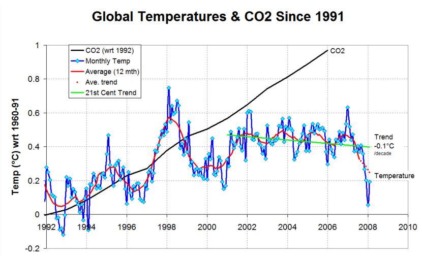 Keywords: GlobalTemperaturesSince1991.png This figure shows the Monthly global temperatures after the 1960-1991 average The data for temperature is relative to the 1960-91 average as is as given by Hadcrut3 http //hadobs metoffice com/hadcrut3/diagnostics/global/nh 2Bsh/monthly the average temperature is a rolling average of 12 months Carbon dioxide concentrations are yearly averages taken from http //www esrl noaa gov/gmd/ with scale adjusted so that 1992 is zero The primary reason for uploading the file is as a visual aid to highlight that recent trend has been for cooling and so prompt a discussion about the use of phrases such as recent warming The CO<sub>2</sub> scale ranges from a low value of 356 ppm to a high of 382 ppmftp //ftp cmdl noaa gov/ccg/co2/trends/co2_annmean_mlo txt Transferred from http //en wikipedia org en wikipedia; transferred to Commons by User SchuminWeb using http //tools wikimedia de/~magnus/commonshelper php CommonsHelper 2008-02-20 Original uploader was Isonomia at http //en wikipedia org en wikipedia Released into the public domain by the author en wikipedia Isonomia Original upload log page en wikipedia GlobalTemperaturesSince1991 png 2008-03-15 10 11 Isonomia 1076×664× 46975 bytes <nowiki></nowiki> 2008-02-20 19 41 Isonomia 977×600× 42442 bytes <nowiki>This figure shows the Monthly global temperatures after the 1960-1991 average The data for temperature is relative to the 1960-91 average as is as given by Hadcrut3 http //hadobs metoffice com/hadcrut3/diagnostics/global/nh 2Bsh/monthly the average te</nowiki> Global warming graphs Line charts Diagrams in English |